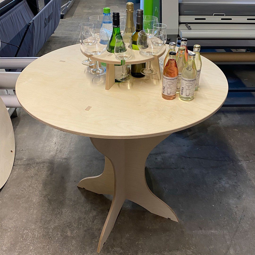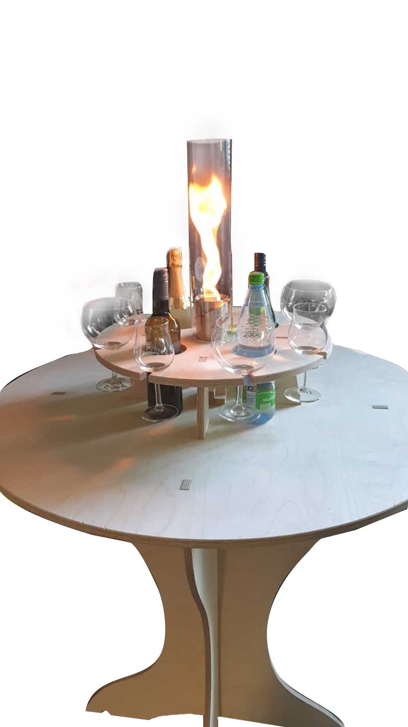 Soll die Feierei zuhause stattfinden? Dann gibt’s das ganze fest stehend in ner Nummer größer. Der klassische WEINSTEHTISCH. Er verfügt über Halterungen für acht Weingläser, verstellbare Füße und integrierte Taschen- bzw. Kleiderhaken. In der Mitte kannst du dich zwischen einer Halterung für vier Flaschen oder einen Wein- und Sektkühler entscheiden. Ganz spannend wird es mit einer Aufnahme für eine original höfats SPIN 90 – Ethanol – Fackel.